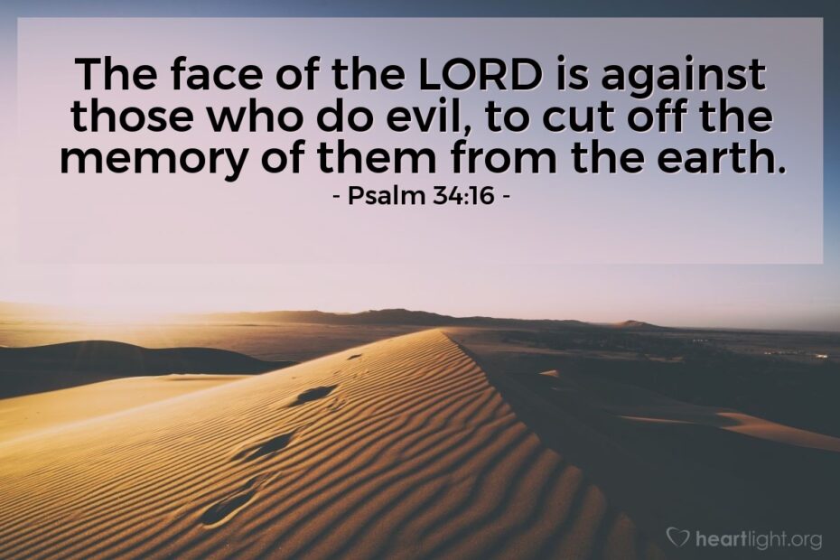 The face of the LORD is against those who do evil, to cut off the memory of them from the earth. —Psalm 34:16 Thoughts on… Read More »Verse of the Day – Psalm 34:16